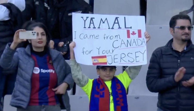 這位小球迷手舉橫幅,上面寫(xiě)著:“亞馬爾,我來(lái)自加拿大,想要你的球衣!”