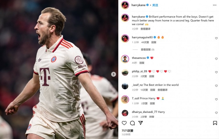 凱恩也在賽后通過社媒曬出自己的比賽照,并配文:“全隊交出精彩表現(xiàn),沒有比這更棒的客場次回合了。八強戰(zhàn)我們來了!”