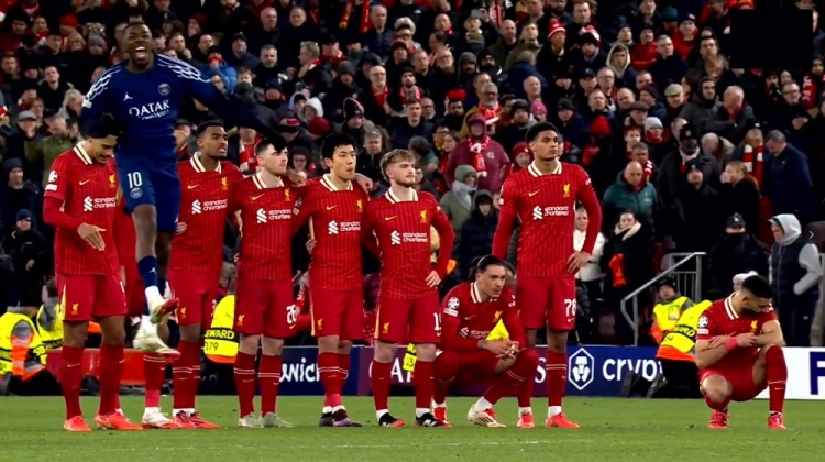 3月12日訊 巴黎vs利物浦點(diǎn)球大戰(zhàn),多納魯馬撲出瓊斯點(diǎn)球后,登貝萊“原地起飛”揮拳慶祝!背景里利物浦眾將垂頭喪氣,努涅斯和薩拉赫蹲地。