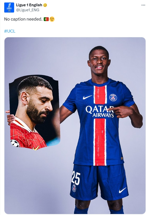 比賽結(jié)束后,法甲英語官推曬出努諾-門德斯手持薩拉赫卡片的P圖,并配文:“無需多言”。