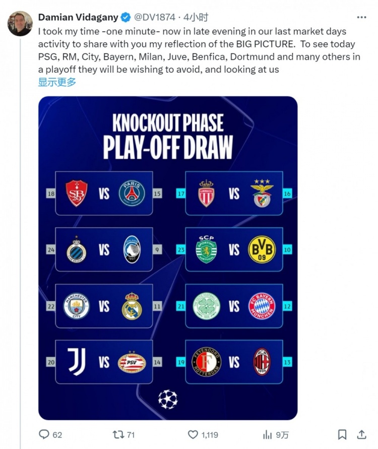 維達(dá)加尼曬出歐冠附加賽的對陣表,并寫道:“在冬窗尾聲階段的晚上,我花一分鐘的時間與大家分享我對整體情況的看法。看到巴黎、皇馬、曼城、拜仁、米蘭、尤文、本菲卡、多特和許多其他球隊都得參加原本想要避免的附加賽,而我們最終卻取得了更好的成績,這讓我為埃梅里、球員、蒙奇、老板和所有幕后人員的辛勤工作感到驕傲?!?/p>