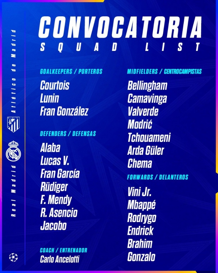 前鋒:維尼修斯、姆巴佩、羅德里戈、恩德里克、卜拉欣-迪亞斯、貢薩洛-加西亞