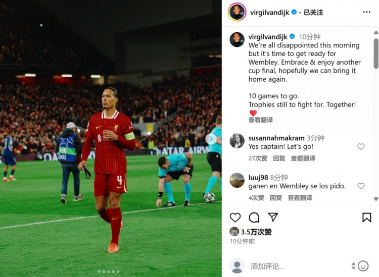 范迪克也在社媒發(fā)文寫(xiě)道:“今天早上我們每個(gè)人都很失望,但現(xiàn)在是時(shí)候?yàn)闇夭祭驁?chǎng)的決賽做好準(zhǔn)備了。擁抱并享受又一場(chǎng)決賽,希望我們能再次把獎(jiǎng)杯帶回家。賽季還剩10場(chǎng)比賽,還要為冠軍而拼搏。我們一起加油!”