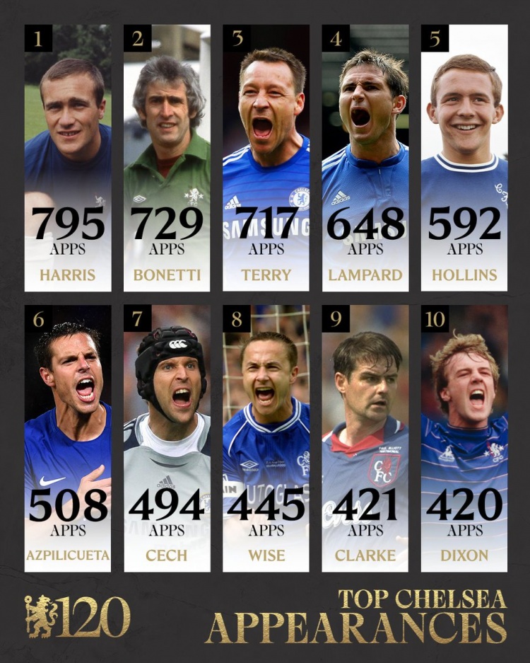 切爾西隊史出場榜:羅恩-哈里斯795場第一,特里第三,蘭帕德第四