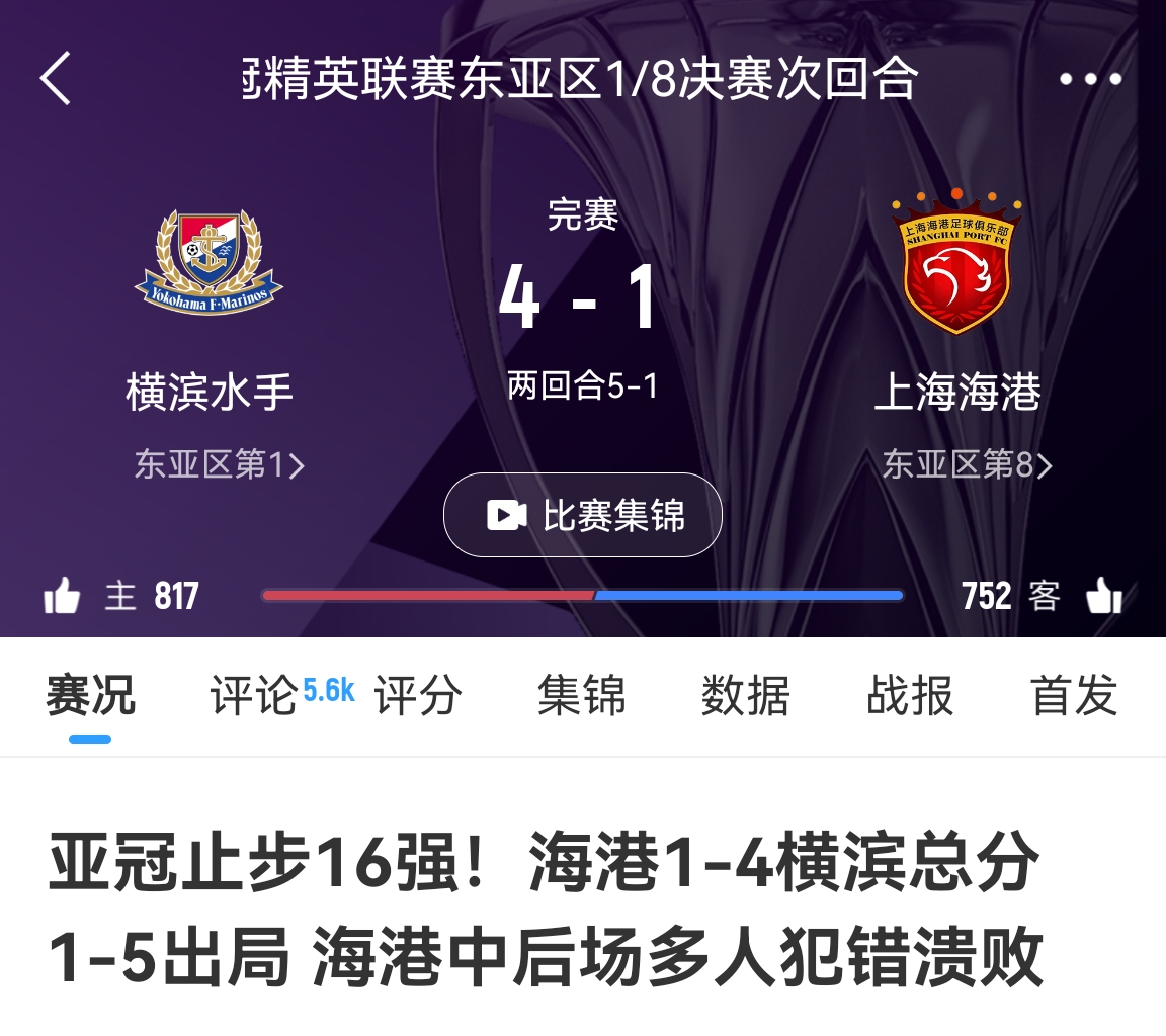 昨天的比賽中,海港客場(chǎng)1-4慘敗橫濱,總比分1-5遭淘汰。