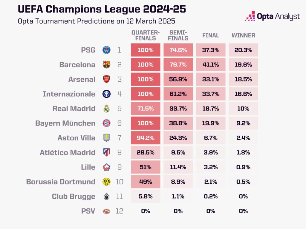 最大熱門(mén)出局!opta最新歐冠奪冠概率:巴黎第1 巴薩第2 皇馬第5