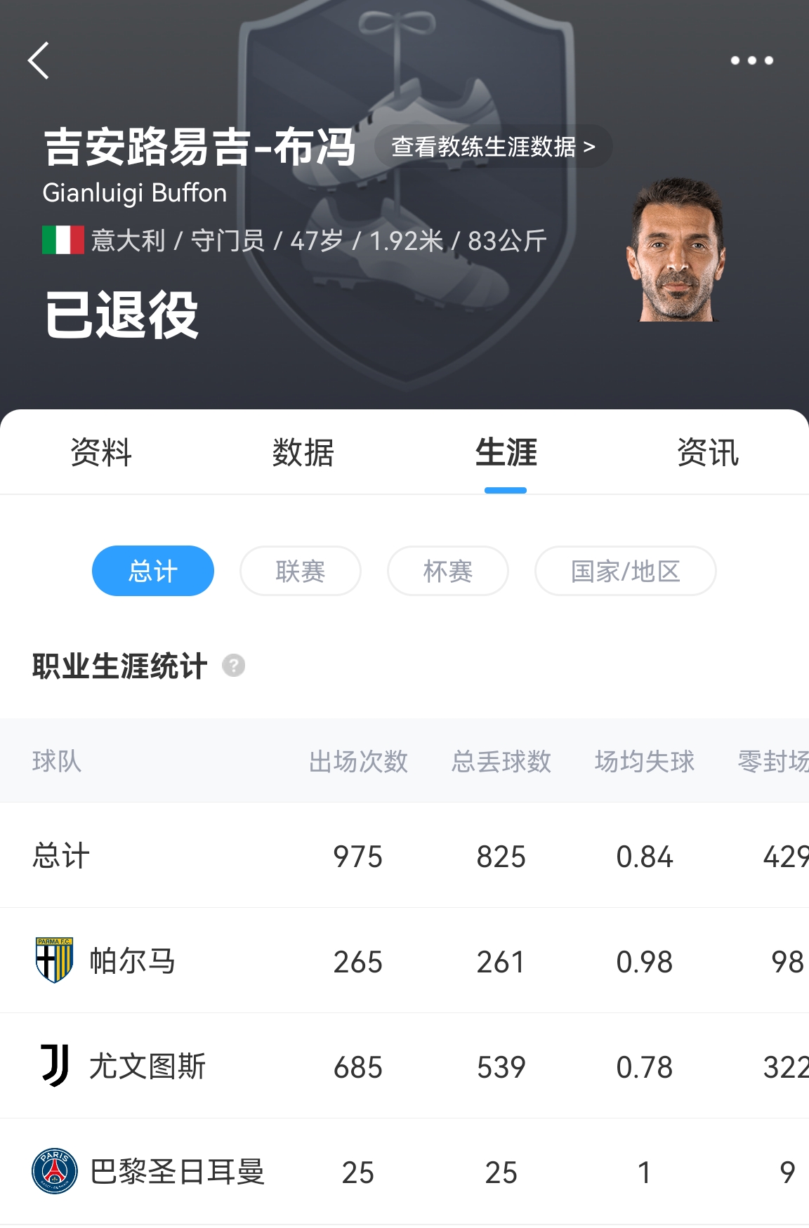 2023年8月45歲的布馮宣布退役時,他的俱樂部出場數(shù)達到了975場,國家隊出場數(shù)達到了176次。