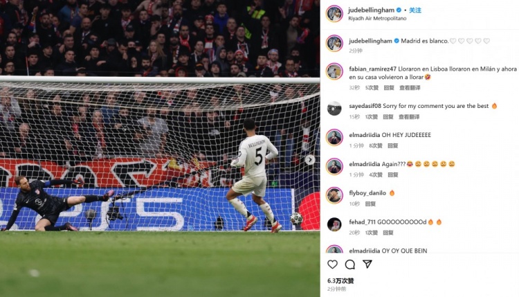 - 同城德比晉級(jí)!貝林厄姆曬點(diǎn)球破門照:馬德里是白色的!