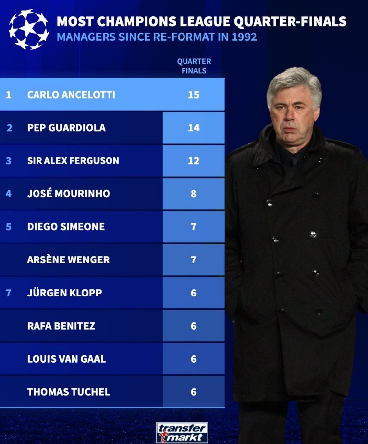 德轉(zhuǎn)也盤點(diǎn)了歐冠改制后主帥率領(lǐng)球隊(duì)晉級(jí)8強(qiáng)的次數(shù)榜,其中安切洛蒂居首。具體如下: