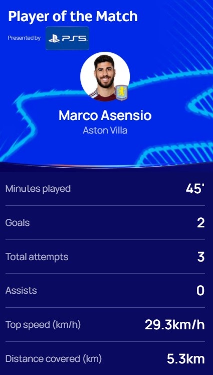 替補(bǔ)雙響,歐冠官方:阿森西奧當(dāng)選維拉3-0布魯日全場最佳球員