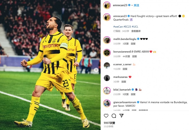 埃姆雷-詹也在賽后通過社媒曬出了自己的怒吼慶祝照,并配文:“全隊(duì)努力鏖戰(zhàn)贏下勝利??????歐冠八強(qiáng)戰(zhàn)????