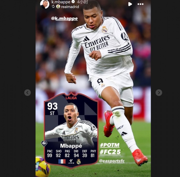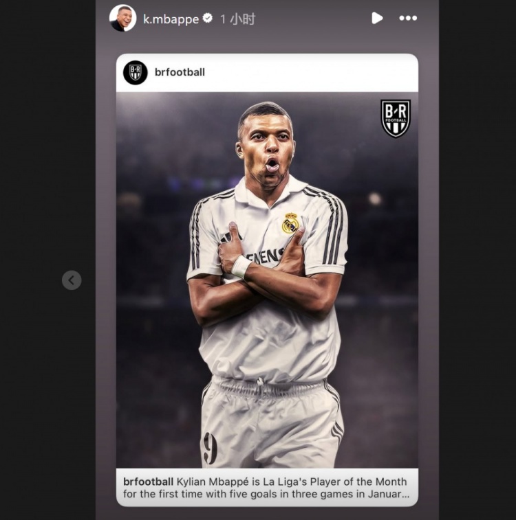 姆巴佩也通過社媒轉發(fā)了相關動態(tài)作為紀念,并配上“月最佳球員”的縮寫。