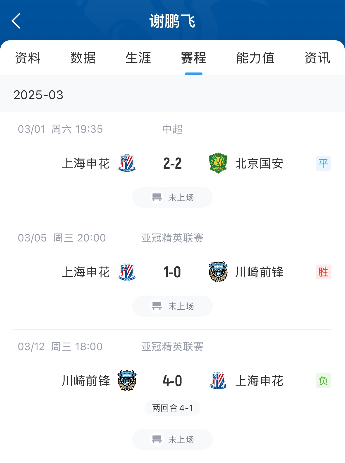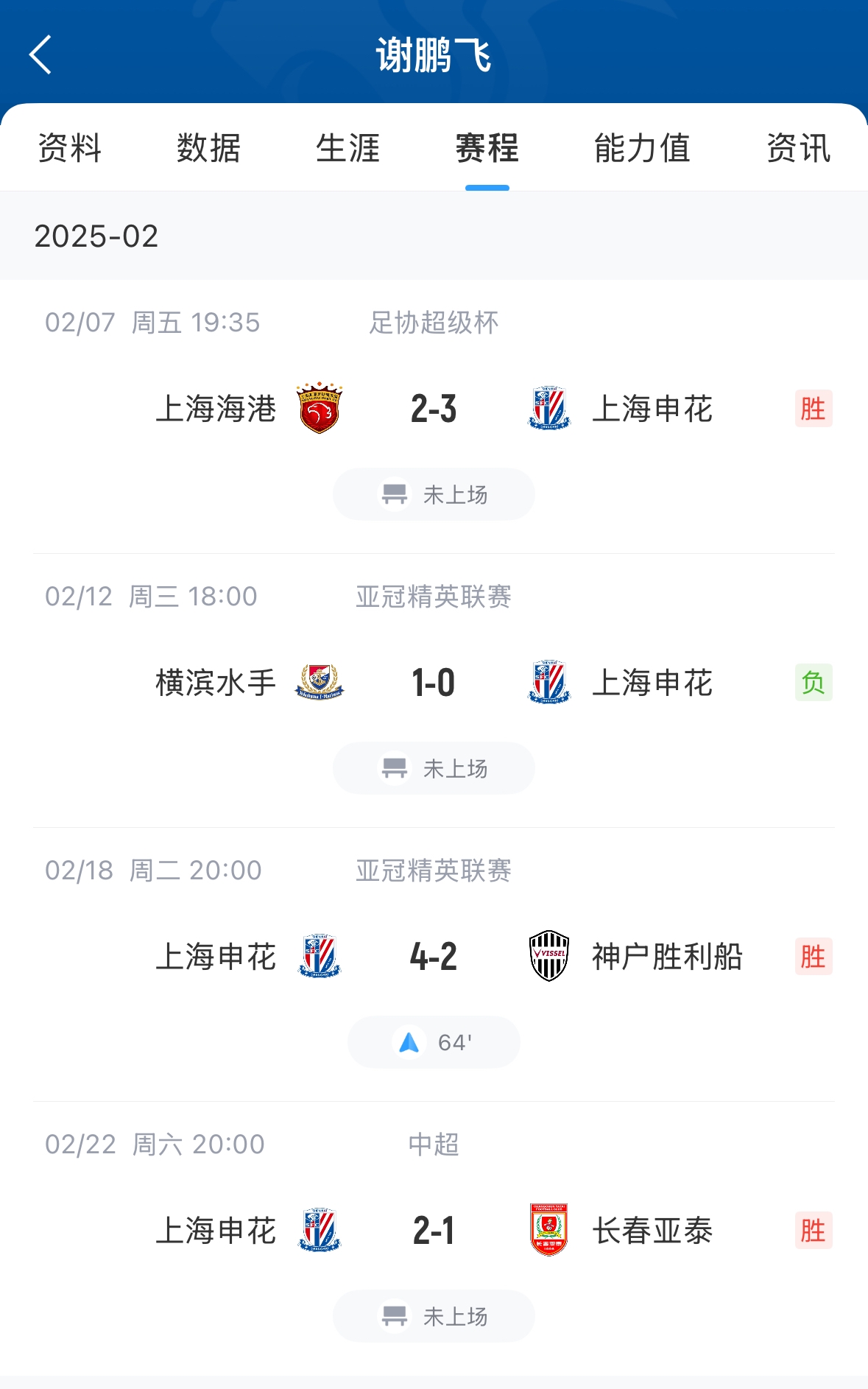 謝鵬飛本場比賽替補未出場,謝鵬飛今年6月底滿32歲,本賽季目前代表申花只出場1次出場時間26分鐘,其余幾場比賽均未出場。