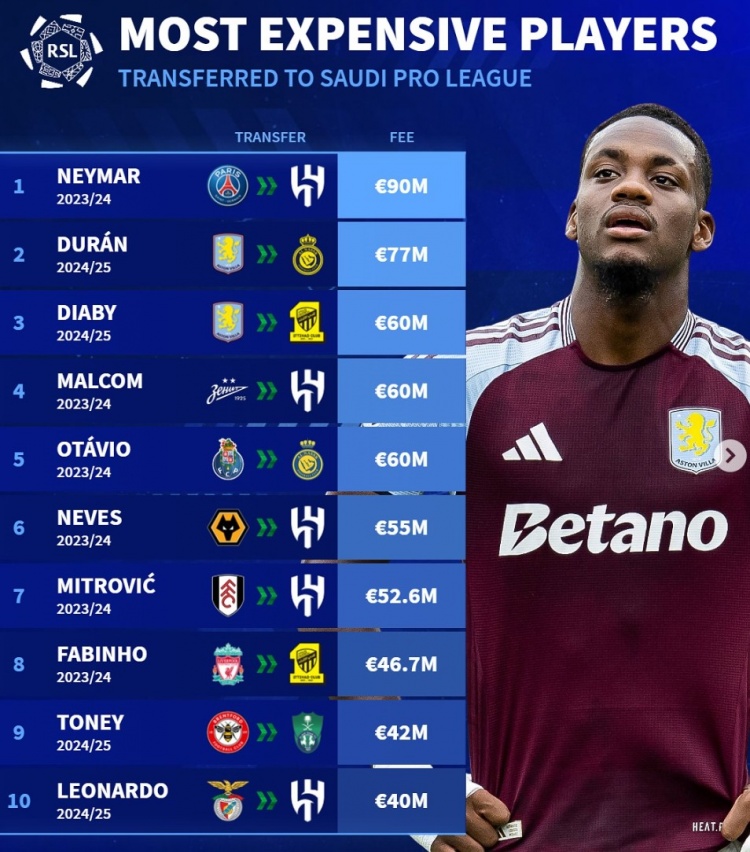 德轉(zhuǎn)列沙特超歷史引援榜:內(nèi)馬爾9000萬(wàn)歐居首,杜蘭7700萬(wàn)歐第二