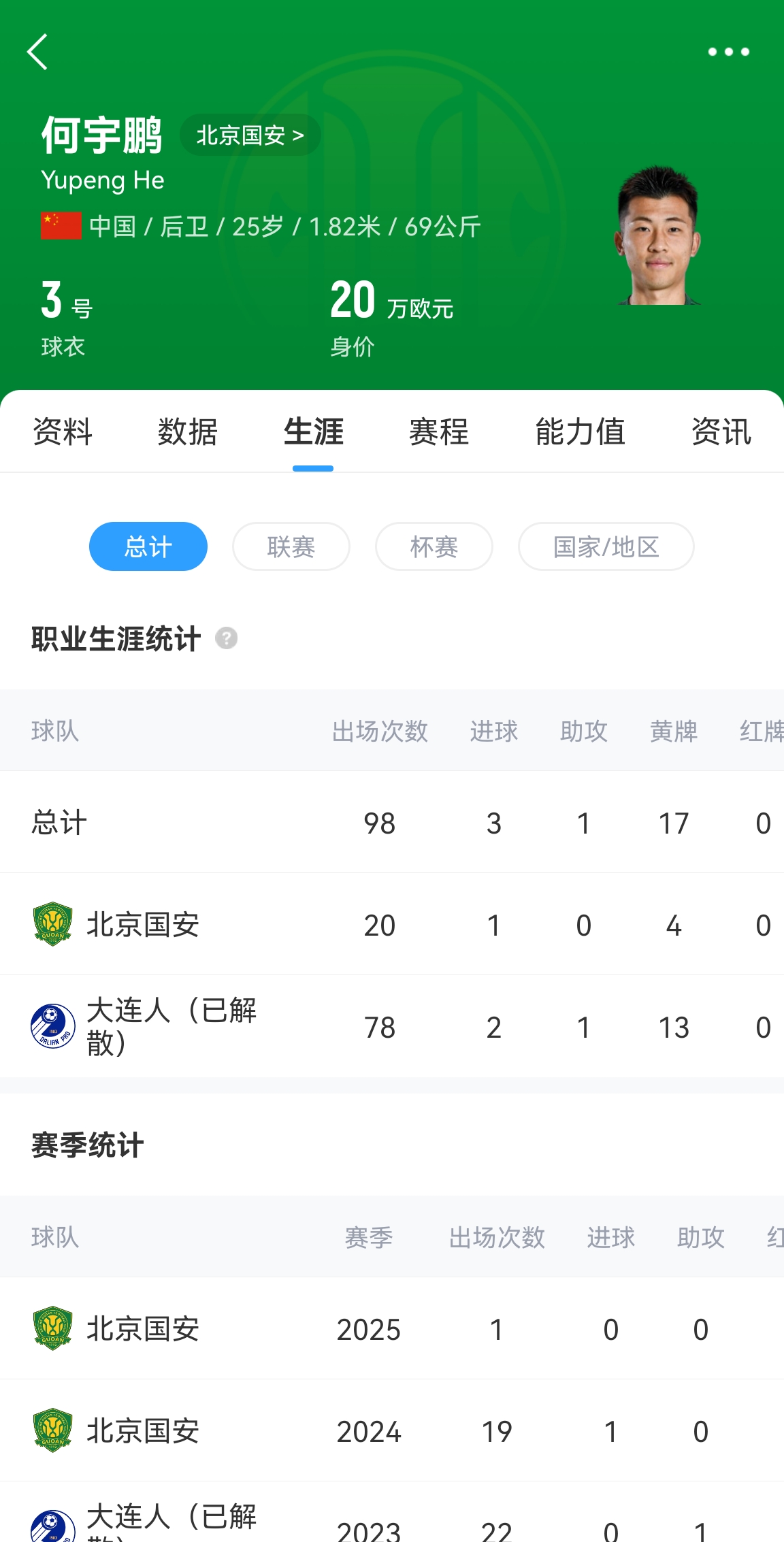 何宇鵬現(xiàn)年25歲,2024年加盟北京國安,本賽季前2輪中超為國安出戰(zhàn)1次。