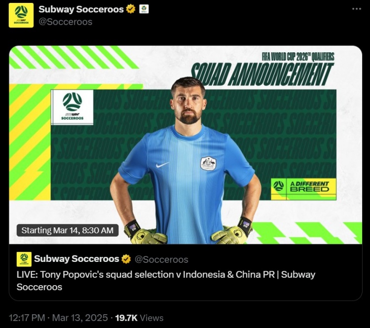 將戰(zhàn)國足!官方:澳大利亞新一期名單明日上午8:30公布
