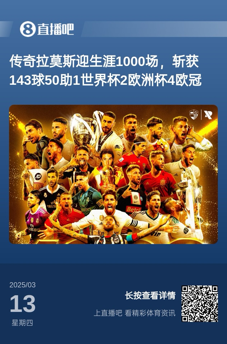 相關(guān)閱讀:傳奇????拉莫斯迎生涯1000場(chǎng),斬獲143球50助1世界杯2歐洲杯4歐冠