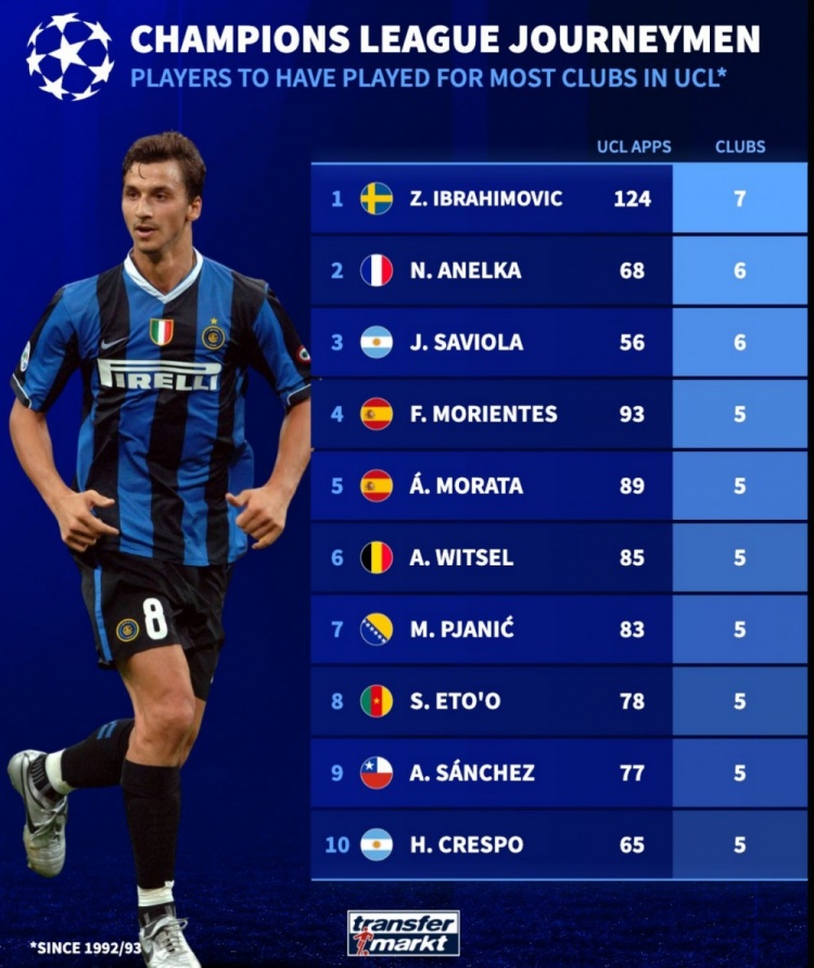 歐冠改制后代表最多球隊參賽榜:伊布7隊居首,阿內(nèi)爾卡次席