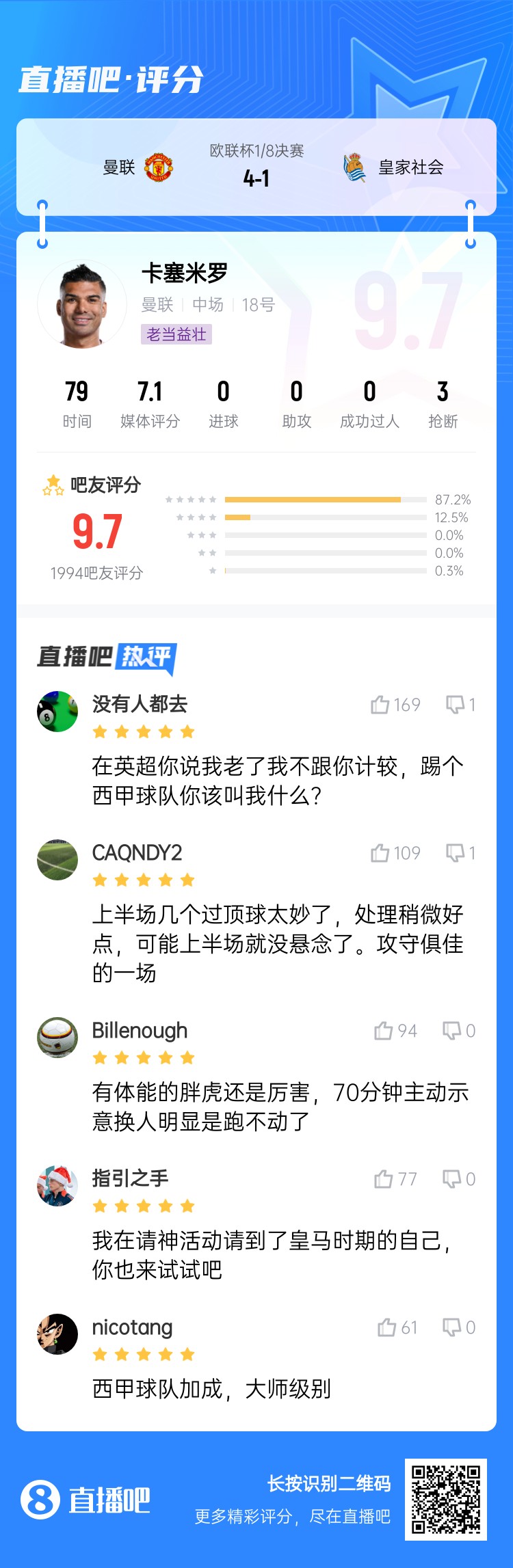 歐聯(lián)1/8決賽次回合,曼聯(lián)4-1戰(zhàn)勝皇家社會(huì)。卡塞米羅本場(chǎng)比賽首發(fā)出戰(zhàn)79分鐘,表現(xiàn)出色,賽后吧友給他打出9.7分的高分。