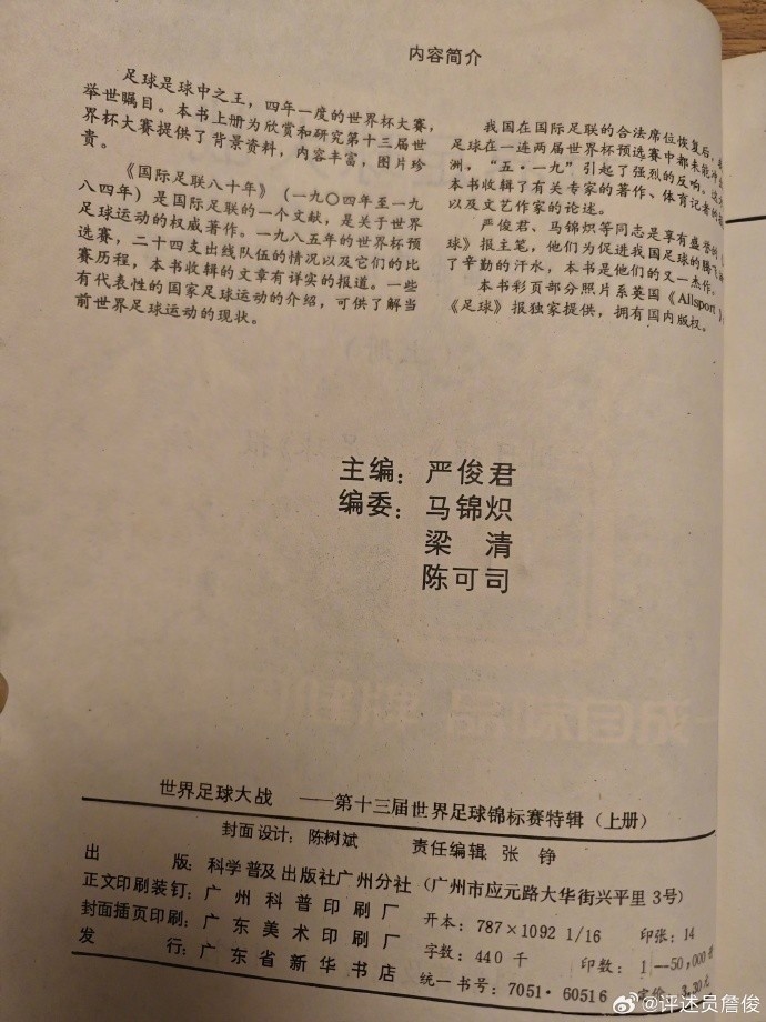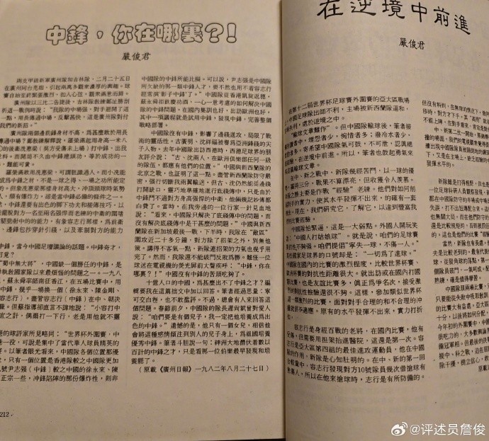 父親說,這些小薄紙片挺“解渴”的。那里肯定也有嚴俊君老總的“耕耘之作”。我開始工作后,和“足球報”很多同行成為好友,可惜那時嚴總已經(jīng)退居二線,無緣相見。今晚得知他老人家駕鶴西去,心中惆悵。謝謝您!曾經(jīng)帶我們這些球迷去“看世界”……