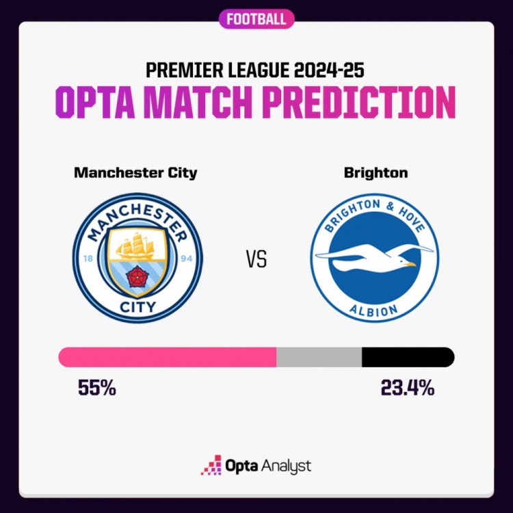 Opta對于本場比賽進(jìn)行了超級計(jì)算機(jī)模擬預(yù)測,曼城獲勝概率55%,布萊頓獲勝概率23.4%,雙方戰(zhàn)平概率21.7%。