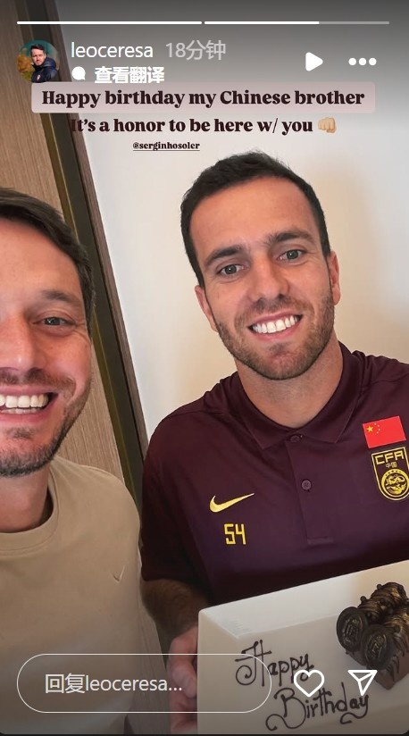 今天是國腳塞爾吉尼奧的30歲生日,他已經抵達迪拜與國足會合并參與合練,萊奧-切雷薩曬出與塞爾吉尼奧的合影,并配文:生日快樂,我的中國兄弟,很榮幸和你一起出現(xiàn)在這里。