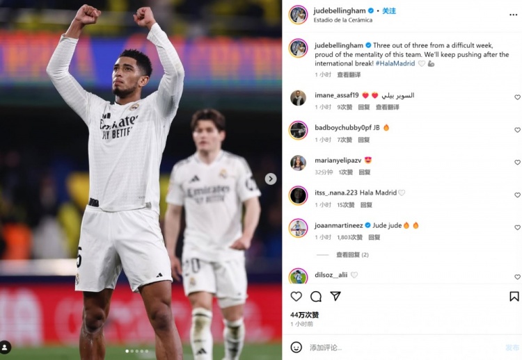 數(shù)據(jù)統(tǒng)計(jì)顯示,他在不到3天內(nèi)出戰(zhàn)了210分鐘比賽。貝林厄姆也在賽后曬出慶祝照,并表示:“在艱難的一周三戰(zhàn)全勝,我為這支球隊(duì)的意志力感到驕傲。我們將在國(guó)家隊(duì)比賽周之后繼續(xù)努力。#馬德里前進(jìn)????????”