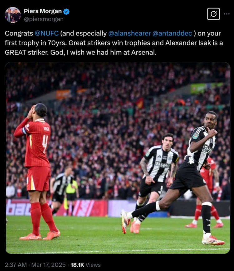 3月17日訊 本賽季聯(lián)賽杯決賽落幕,紐卡2-1擊敗利物浦捧杯,終結(jié)70年冠軍荒。賽后,知名槍迷、英國名嘴皮爾斯-摩根向紐卡送上祝賀。