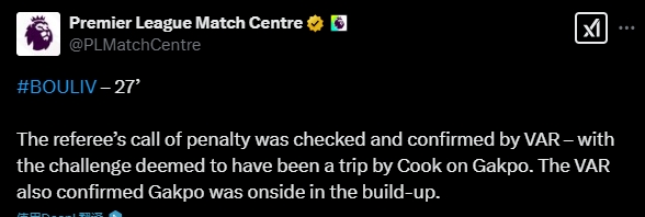 英超官方解釋這一判罰:裁判判罰的點球經(jīng)過VAR核實和確認,庫克的搶斷絆倒了加克波,VAR同時確認加克波在進攻中不在越位位置。