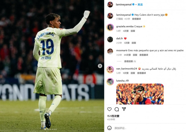 數(shù)據(jù)統(tǒng)計(jì)顯示,亞馬爾也就此結(jié)束了長達(dá)4個半月的西甲進(jìn)球荒,他本人也通過社媒曬照慶祝:“嘿,巴薩球迷們,別擔(dān)心,哈哈????”。