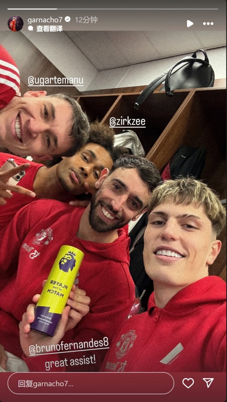 加納喬在社交媒體上曬出與B費(fèi)、齊爾克澤、烏加特賽后的更衣室合照,他手拿B費(fèi)的全場最佳獎(jiǎng)杯,配文:“很棒的助攻?!?/p>
