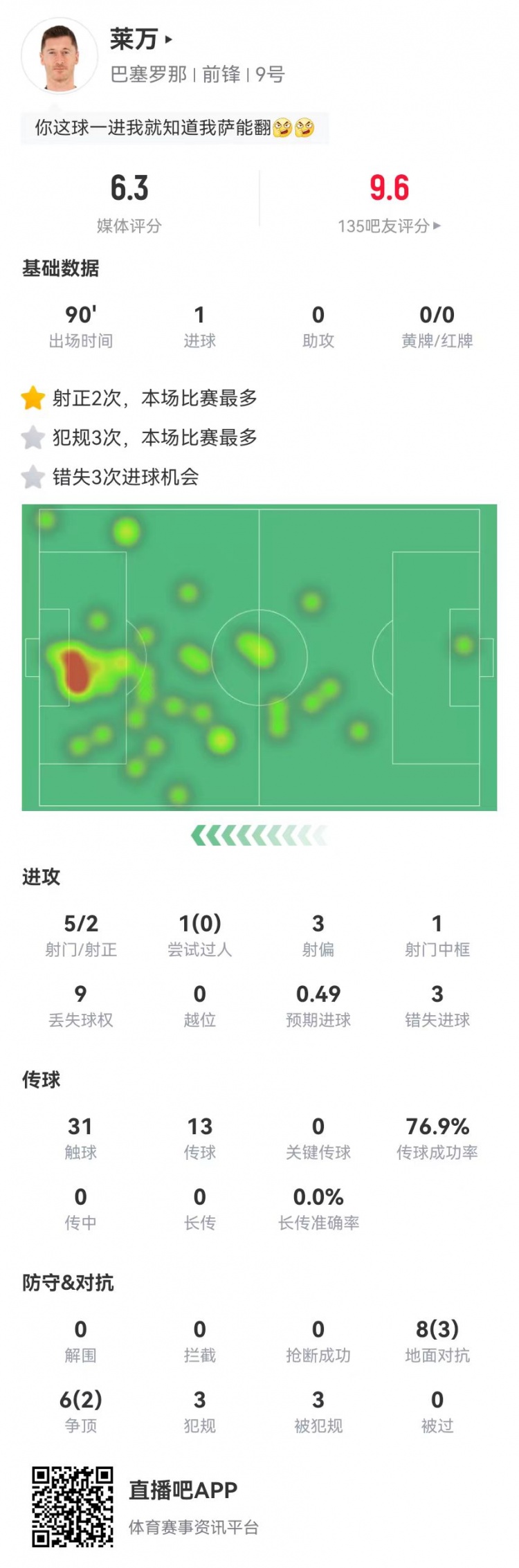 萊萬(wàn)本場(chǎng)5射2正 1球3失良機(jī) 14對(duì)抗5成功 3犯規(guī)3造犯規(guī) 僅獲6.3分