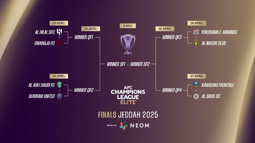 本賽季亞冠精英聯(lián)賽,從1/4決賽開始為集中賽會制的單場淘汰賽,2025年4月25日至5月4日在沙特舉行。