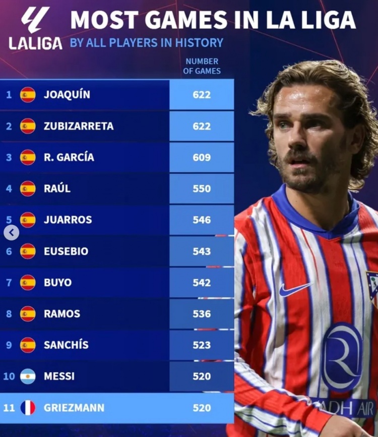 西甲歷史球員出場榜:華金622場居首,梅西&格子并列第10