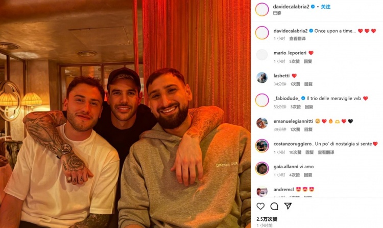 卡拉布里亞曬出了自己和特奧、多納魯馬的合照,并配文:“曾幾何時(shí)……??????”