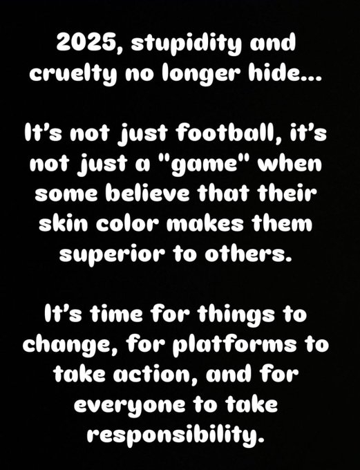 韋斯利-福法納寫道:“2025年,人們已經(jīng)毫不掩飾自己的愚蠢和殘忍。當(dāng)有人認(rèn)為他們僅憑膚色就比別人更優(yōu)越時(shí),這不僅僅是足球的問題,這不僅僅是一個(gè)比賽的問題。”