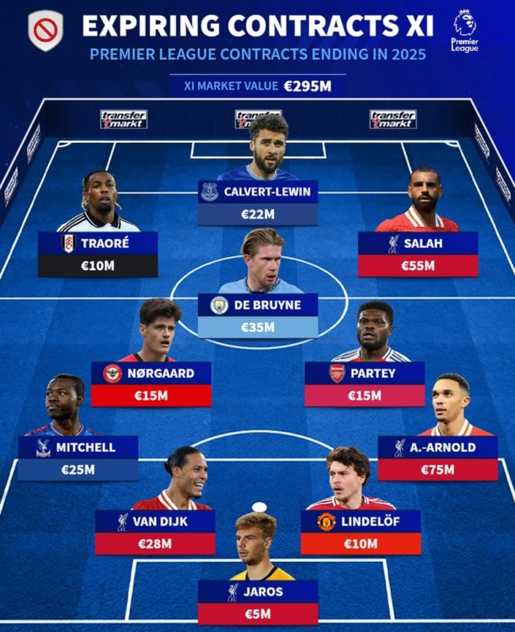 德轉(zhuǎn)列英超合同到期最貴陣:總身價(jià)2.95億歐元