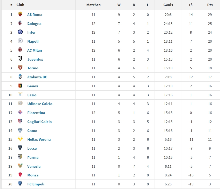 意甲2025年度積分榜:羅馬29分居首,國米第三,米蘭尤文位列五六