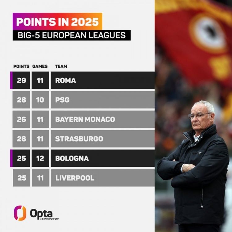 3月18日訊 國(guó)家隊(duì)比賽周來(lái)襲,五大聯(lián)賽暫時(shí)告一段落,OPTA也統(tǒng)計(jì)了2025年五大聯(lián)賽拿分情況,羅馬居首。