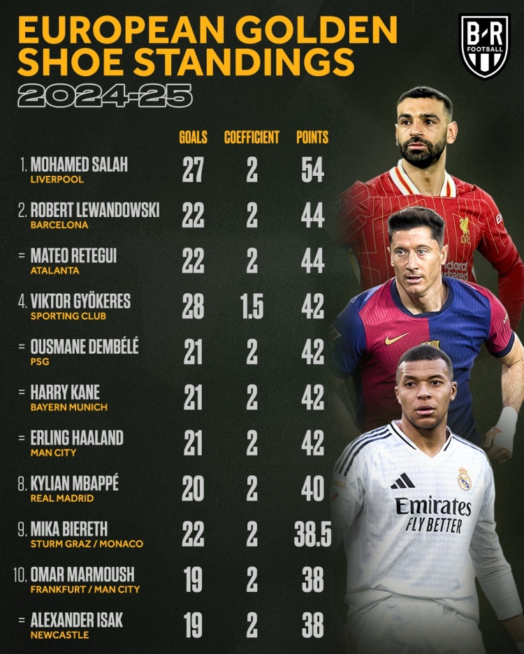 本賽季歐洲金靴排名:薩拉赫54分領(lǐng)跑,萊萬、雷特吉44分次席