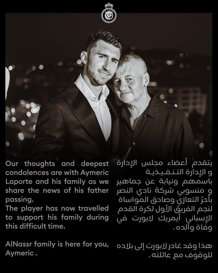 利雅得勝利官推寫道:“得知拉波爾特的父親去世的消息,我們對(duì)他和他的家人表示最深切的哀悼。”