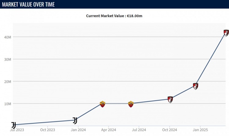 懷森是在去年夏天由尤文圖斯加盟伯恩茅斯,來到英超以后身價開始逐步攀升,由去年10月份的1200萬歐先是漲至1800萬歐,目前達(dá)到4200萬歐。