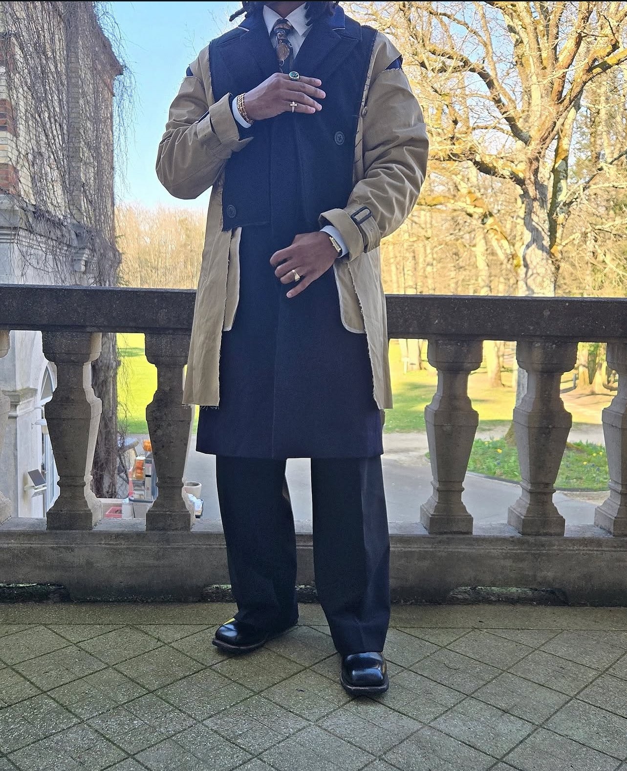 這一次孔德的穿搭中,最引人注目的就是他身上的拼接外套,這件大衣來自日本小眾設計師品牌FACETASM,是2022-23的秋冬系列中的一件。