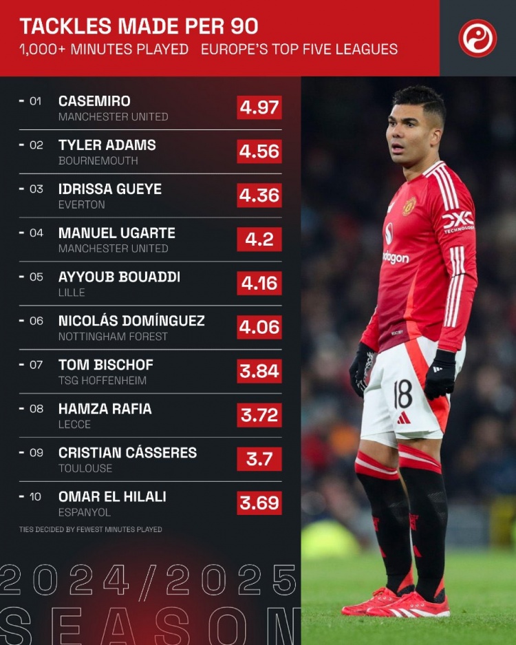 五大聯(lián)賽每90分鐘搶斷榜:卡塞米羅居首,亞當(dāng)斯、蓋耶二三位