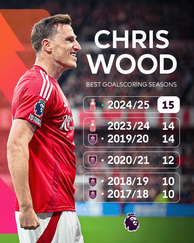 據(jù)英超官方數(shù)據(jù)統(tǒng)計(jì),本賽季到目前為止,伍德已經(jīng)在英超聯(lián)賽中打進(jìn)15粒進(jìn)球,這是他進(jìn)球最多的一個(gè)賽季,此前,他曾在2019-20賽季以及2023-24賽季打進(jìn)14球。