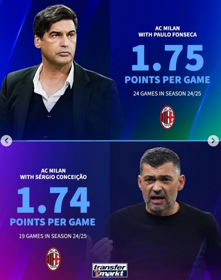 本賽季中途換帥6支球隊場均積分變化:曼聯(lián)提升0.36分,米蘭下降