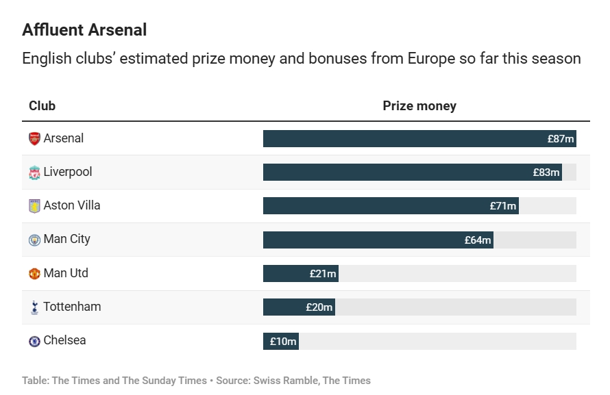 本賽季歐足聯(lián)調(diào)整了歐戰(zhàn)收入分配體系,使賽季期間的表現(xiàn)獲得更多經(jīng)濟回報而非依賴歷史成績。與上賽季相比,歐冠的總獎金池增加了20%以上,歐足聯(lián)為比賽勝利、小組賽階段積分榜排名以及晉級淘汰賽提供了比例更高的獎金。而基于俱樂部歷史表現(xiàn)計算的歐足聯(lián)系數(shù)排名所占的獎金比例減少。例如,曼城未能進入淘汰賽階段,其預(yù)計收入約為6400萬英鎊;而阿斯頓維拉晉級四分之一決賽后至少賺了7100萬英鎊。
