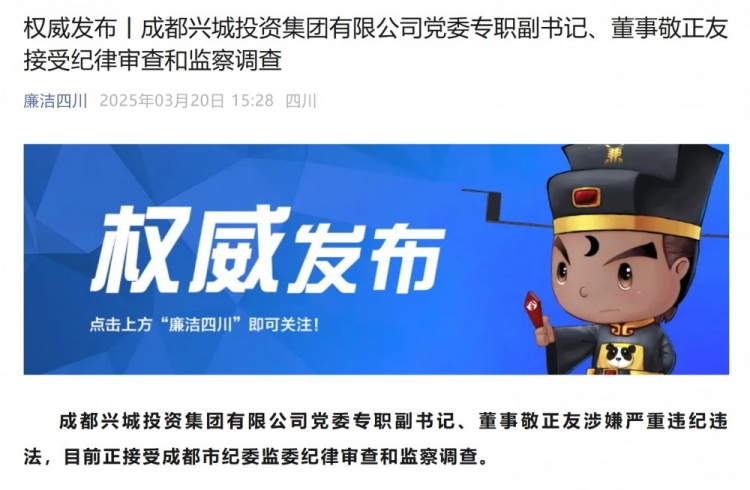 3月20日訊 根據(jù)“廉潔四川”公眾號消息,成都興城投資集團有限公司黨委專職副書記、董事敬正友接受紀律審查和監(jiān)察調(diào)查。