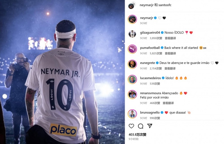 內(nèi)馬爾也曬出自己在昨日于主場(chǎng)接受球迷歡迎的照片,并附上“????????”配色表情符號(hào),后者也是桑托斯隊(duì)徽的主要配色。