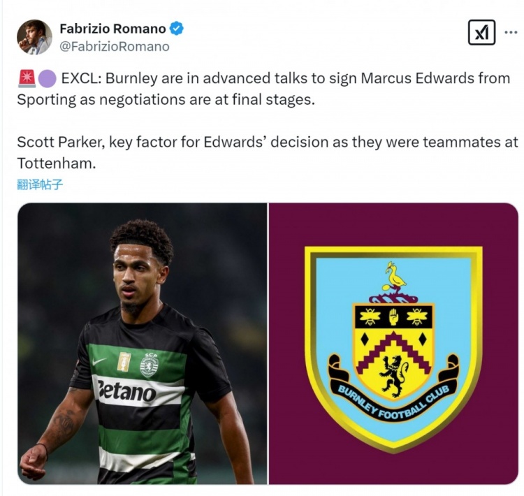 羅馬諾指出,伯恩利對(duì)葡萄牙體育26歲邊鋒愛(ài)德華茲感興趣,正在深入商談球員的轉(zhuǎn)會(huì),談判已進(jìn)入最后階段。伯恩利主帥斯科特-帕克將是愛(ài)德華茲做出決定的關(guān)鍵因素,兩人都曾為熱刺效力。